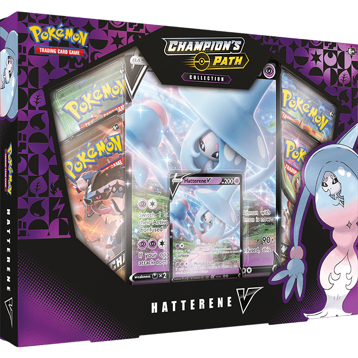 When you find Hatterene in the Galar region, you won't hear much—but this Pokémon's silence speaks louder than most! With its perplexing moves and awesome Psychic-type powers, Hatterene V leaves foes weak and confused, then glides away on its own mysterious errands. In this Pokémon TCG: Champion's Path Collection, you'll get Hatterene V as a playable foil promo card and a fantastic oversize card. You'll also discover more surprises in Pokémon TCG: Champion's Path booster packs!