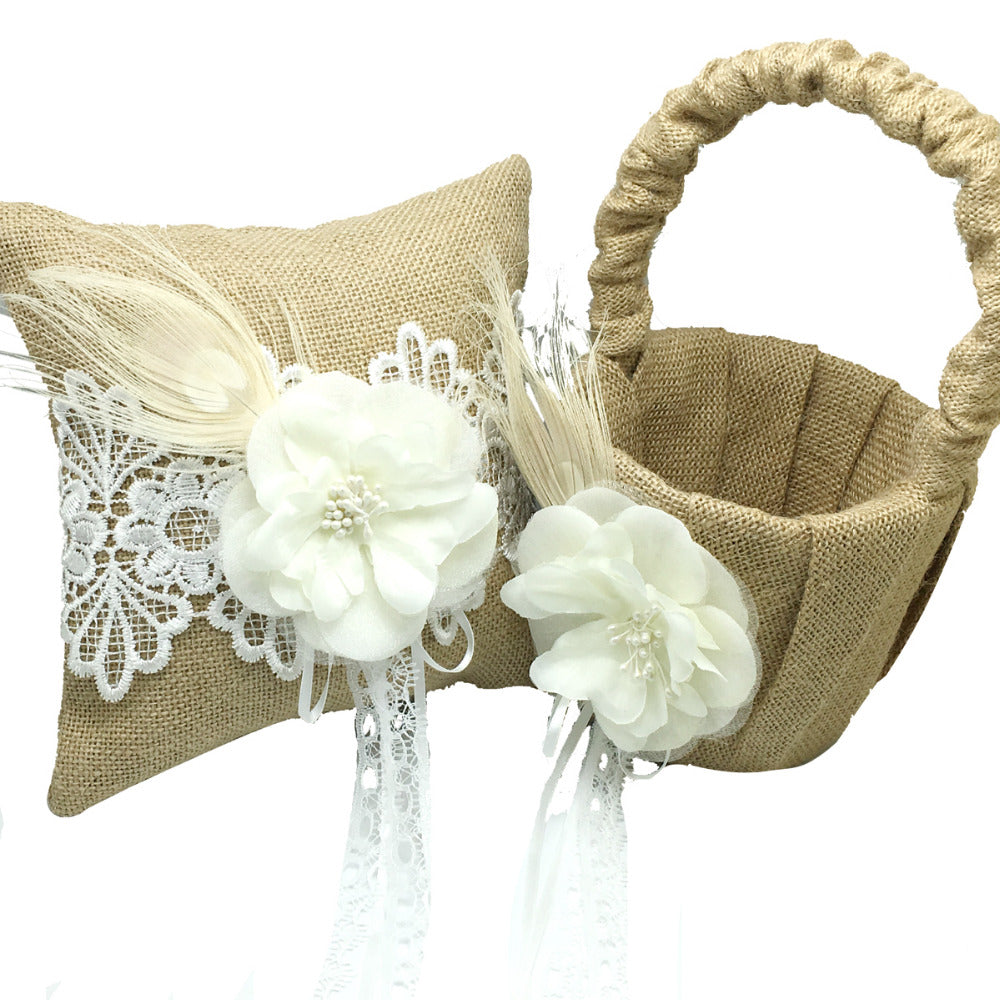 This vintage burlap and white flower collection set comes with all the elements you need for your ceremony and reception. Included you will find a coordinating guestbook, pen, pen holder, ring bearer pillow, and flower girl basket. Perfect for country style wedding!
