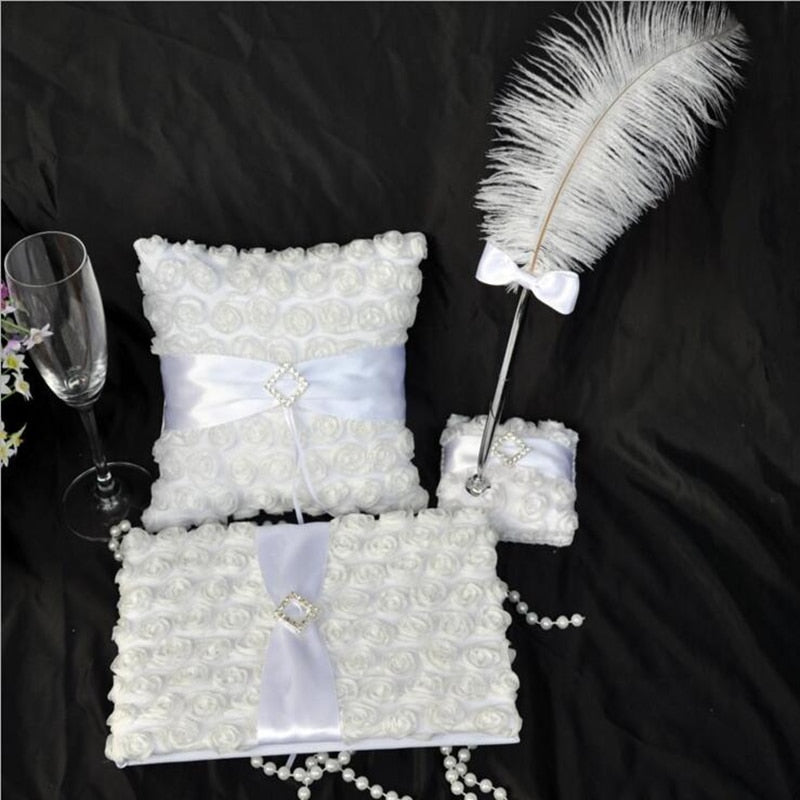 Elegant white rose set (Guest book, Flower Basket, Pen Holder, Ring Pillow, Feather Pen)